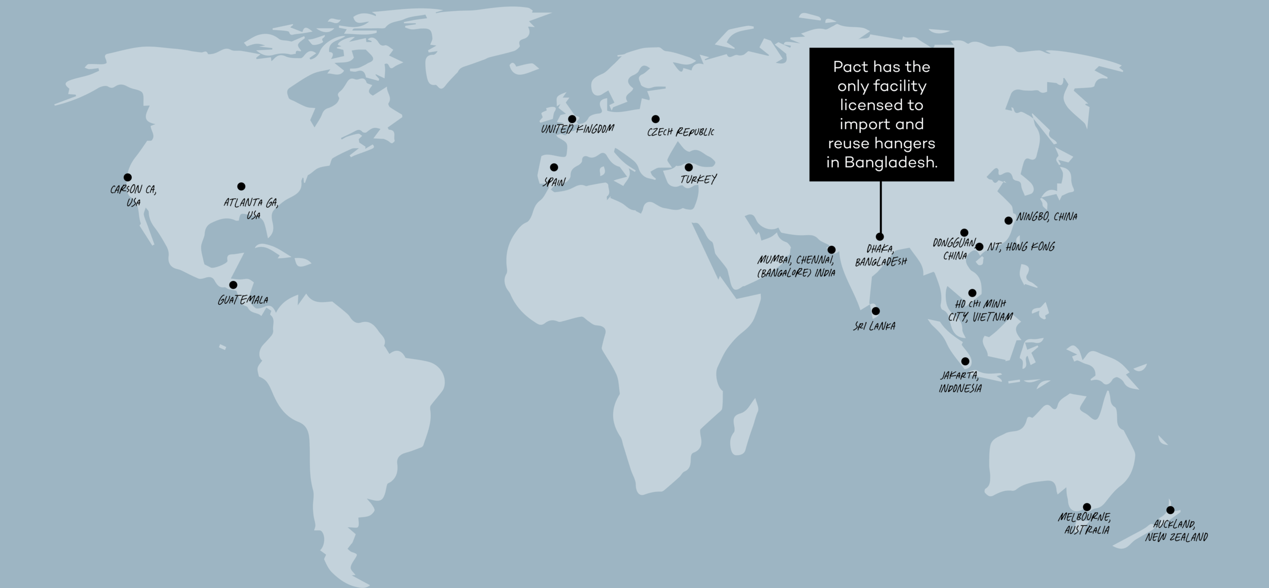 Reuse hangers are shipped to garment suppliers and applied to garments before packing and shipping. Pact’s global network ensures fast & reliable supply in all the most important garment manufacturing regions.